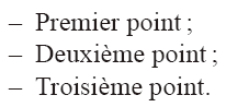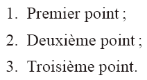 Pour la première colonne, à condition d'inclure le package enumerate dans le préambule, écrire \begin{enumerate}[(i)] à la place de \begin{enumerate} permet de remplacer automatiquement les traditionnels 1., 2. et 3. de l'exemple ci-dessus par (i), (ii) et (iii). D'autres combinaisons sont possibles, par exemple \begin{enumerate}[a)] donnera a), b) et c).
