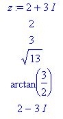 z:=2+3*I; # on définit un complexe z, et on peut alors avoir... Re(z); # ... sa partie réelle Im(z); # ... sa partie imaginaire abs(z); # ... son module argument(z); # ... son argument conjugate(z); # ... son conjugué |