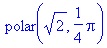 | > polar(sqrt(2), Pi/4); # nombre complexe de module 2 et d'argument Pi/4 | |