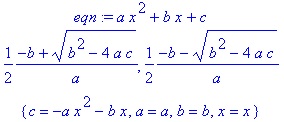 > eqn := a*x^2+b*x+c; solve(eqn, x); # Correct ! solve(eqn); # Attention... |